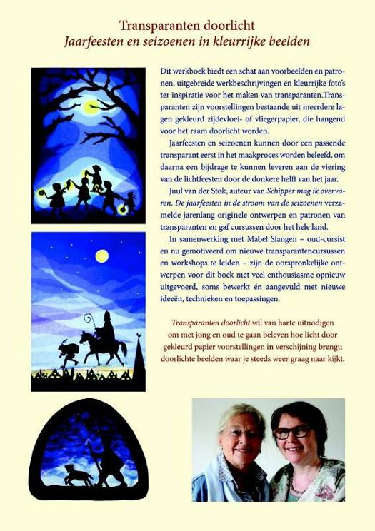 Dit werkboek biedt een schat aan voorbeelden en patronen, uitgebreide werkbeschrijvingen en kleurrijke foto's ter inspiratie voor het maken van transparanten.Transparanten zijn voorstellingen bestaande uit meerdere lagen gekleurd zijdevloei- of vliegerpapier, die hangend voor het raam doorlicht worden. Jaarfeesten en seizoenen kunnen door een passende transparant eerst in het maakproces worden beleefd, om daarna een bijdrage te kunnen leveren aan de viering van de lichtfeesten door de donkere helft van het jaar. Juul van der Stok, auteur van Schipper mag ik overvaren. De jaarfeesten in de stroom van de seizoenen verzamelde jarenlang originele ontwerpen en patronen van transparanten en gaf cursussen door het hele land. In samenwerking met Mabel Slangen - oud-cursist en nu gemotiveerd om nieuwe transparantencursussen en workshops te leiden - zijn de oorspronkelijke ontwerpen voor dit boek met veel enthousiasme opnieuw uitgevoerd, soms bewerkt én aangevuld met nieuwe ideeën, technieken en toepassingen.