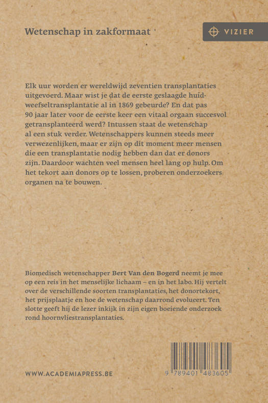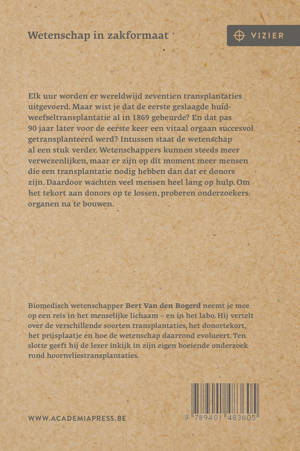 Biomedisch wetenschapper Bert Van den Bogerd neemt je mee op een reis in het menselijke lichaam - en in het labo. Hij vertelt over de verschillende soorten transplantaties, het donortekort, het prijsplaatje en hoe de wetenschap daarrond evolueert. Ten slotte geeft hij de lezer inkijk in zijn eigen boeiende onderzoek rond hoornvliestransplantaties.