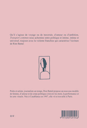 Qu'il s'agisse de voyage ou de traversée, d'amour ou d'ambition,Transport commun nous achemine entre politique et intime, intime et universel, toujours avec la violente franchise qui caractérise l'écriture de Rim Battal. Tanger, où se côtoient l'occidental voyageur et la misère des habitants, Melania Trump,ou la sainteté de la playmate, ou encore la vie d'une jeune femme, l'amour, la maternité, tels sont les thèmes qui parcourent le livre. Rim Battal a été distingué par les Inrocks comme l'une des 10 jeunes poètes qui comptent.