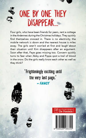 Four girls, who have been friends for years, rent a cottage in the Ardennes during the Christmas holidays. They quickly find themselves snowed in. There is no electricity, the mobile network is down and the nearest house is miles away. The girls aren’t worried at first and laugh about their situation until Kim disappears after an argument. Soon after that, Faye goes missing too. Concern quickly turns to fear when Abby and Pippa spot a trail of blood in the snow. Do the girls really know each other as well as they think?