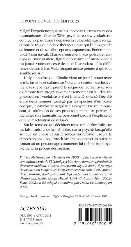 Sur les tensions qui déchirent toute cellule familiale, sur les falsifications de la mémoire, sur la psyché lorsqu'elle se mue en chaos et sur le retour du refoulé jusqu'à la dépossession de soi, Patrick McGrath donne ici un puissant roman où un personnage commente lui-même, impitoyablement, sa propre destruction.