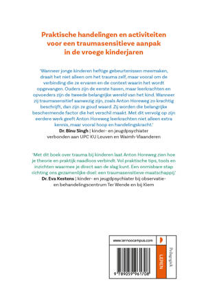 'Wanneer jonge kinderen heftige gebeurtenissen meemaken, draait het niet alleen om het trauma zelf, maar vooral om de verbinding die ze ervaren en de context waarin het wordt opgevangen. Ouders zijn de eerste haven, maar leerkrachten en opvoeders zijn de tweede belangrijke wereld van het kind. Wanneer zij traumasensitief aanwezig zijn, zoals Anton Horeweg zo krachtig beschrijft, dan zijn ze goud waard. Zij worden die belangrijke beschermende factor die het verschil maakt. Met dit vervolg op zijn eerdere werk geeft Anton Horeweg leerkrachten niet alleen extra kennis, maar vooral hoop en handelingskracht.' - Dr. Binu Singh | kinder- en jeugdpsychiater verbonden aan UPC KU Leuven en Waimh-Vlaanderen 'Met dit boek over trauma bij kinderen laat Anton Horeweg zien hoe je theorie en praktijk naadloos verbindt. Vol praktische tips, tools en inzichten waarmee je direct aan de slag kunt. Een onmisbare stap richting ons gezamenlijke doel: een traumasensitieve maatschappij.' - Dr. Eva Kestens | kinder- en jeugdpsychiater bij observatie- en behandelingscentrum Ter Wende en bij Kiem