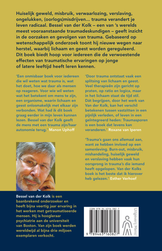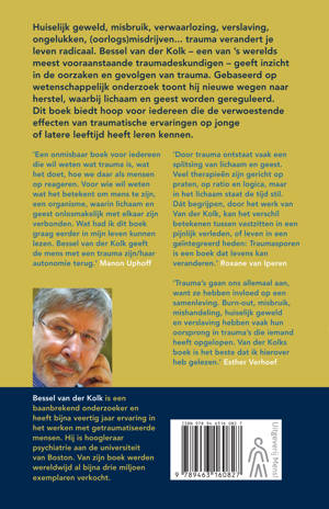 ‘Een onmisbaar boek voor iedereen die wil weten wat trauma is, wat het doet, hoe we daar als mensen op reageren. Voor wie wil weten wat het betekent om mens te zijn, een organisme, waarin lichaam en geest onlosmakelijk met elkaar zijn verbonden. Wat had ik dit boek graag eerder in mijn leven kunnen lezen. Bessel van der Kolk geeft de mens met een trauma zijn/haar autonomie terug.’ Manon Uphoff