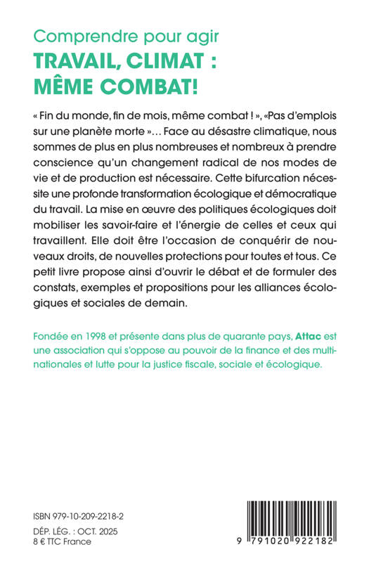 « Fin du monde, fin de mois, même combat ! », «Pas d'emplois sur une planète morte »... Face au désastre climatique, nous sommes de plus en plus nombreuses et nombreux à prendre conscience qu'un changement radical de nos modes de vie et de production est nécessaire. Cette bifurcation nécessite une profonde transformation écologique et démocratique du travail. La mise en oeuvre des politiques écologiques doit mobiliser les savoir-faire et l'énergie de celles et ceux qui travaillent. Elle doit être l'occasion de conquérir de nouveaux droits, de nouvelles protections pour toutes et tous. Ce petit livre propose ainsi d'ouvrir le débat et de formuler des constats, exemples et propositions pour les alliances écologiques et sociales de demain .