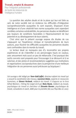 Le présent ouvrage expose dix études de cas s’appuyant sur l’expérience clinique et transdisciplinaire de leurs auteurs, pour illustrer les difficultés auxquelles les personnes douées sont confrontées dans le monde du travail. Le lecteur doué ne manquera pas d’y reconnaître ses propres expériences et de s’identifier à ces personnages hauts en couleur, avec amusement mais aussi un peu de mélancolie. C’est pourquoi des outils concrets sont proposés, et des pistes et recommandations suggérées aux institutions et organisations socioproductives dans la perspective d’une meilleure intégration de ces personnes aussi précieuses qu’atypiques !