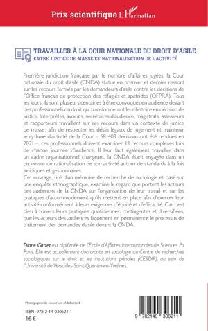 Première juridiction française par le nombre d'affaires jugées, la Cour nationale du droit d'asile (CNDA) statue en premier et dernier ressort sur les recours formés par les demandeurs d'asile contre les décisions de l'Office français de protection des réfugiés et apatrides (OFPRA). Tous les jours, ils sont plusieurs centaines à être convoqués en audience devant des professionnels du droit qui transformeront leur histoire en décision de justice. Interprètes, avocats, secrétaires d'audience, magistrats, assesseurs et rapporteurs travaillent sur ces recours dans un contexte de justice de masse afin de respecter les délais légaux de jugement et maintenir le rythme d'activité de la Cour - 68 403 décisions ont été rendues en 2021 -, ces professionnels doivent examiner 13 recours complexes lors de chaque journée d'audience. Il leur faut également travailler dans un cadre organisationnel changeant, la CNDA étant engagée dans un processus de rationalisation de son activité autour de standards à la fois juridiques et gestionnaires. Cet ouvrage, tiré d'un mémoire de recherche de sociologie et basé sur une enquête ethnographique, examine le regard que portent les acteurs des audiences de la CNDA sur l'organisation de leur travail et sur les pratiques d'accommodement qu'ils mettent en place afin d'exercer leur activité conformément à leurs exigences d'équité et d'efficacité. Car c'est bien à travers leurs pratiques quotidiennes, contingentes et diversifiées, que les acteurs des audiences façonnent en permanence le processus de traitement des demandes d'asile devant la CNDA.