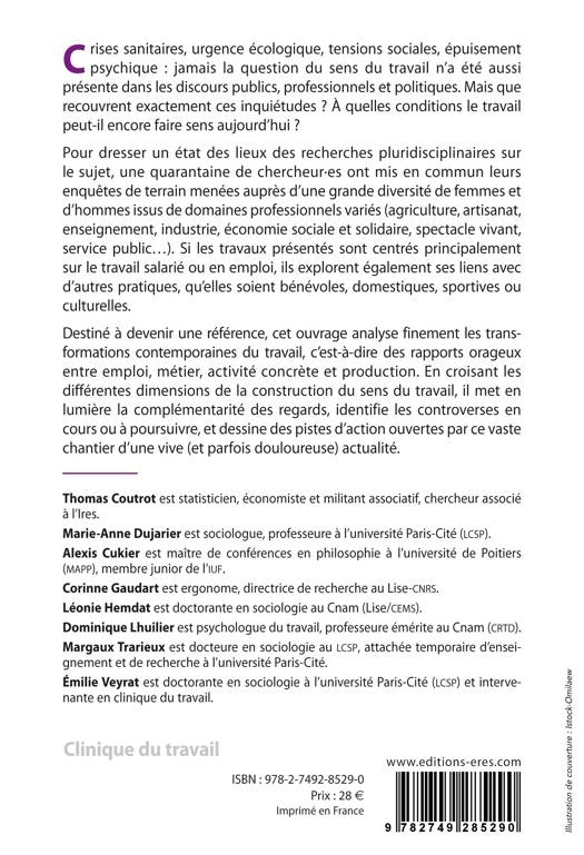 Crises sanitaires, urgence écologique, tensions sociales, épuisement psychique : jamais la question du sens du travail n’a été aussi présente dans les discours publics, professionnels et politiques. Mais que recouvrent exactement ces inquiétudes ? À quelles conditions le travail peut-il encore faire sens aujourd’hui ? Pour dresser un état des lieux des recherches pluridisciplinaires sur le sujet, une quarantaine de chercheur·es ont mis en commun leurs enquêtes de terrain menées auprès d’une grande diversité de femmes et d’hommes issus de domaines professionnels variés (agriculture, artisanat, enseignement, industrie, économie sociale et solidaire, spectacle vivant, service public…). Si les travaux présentés sont centrés principalement sur le travail salarié ou en emploi, ils explorent également ses liens avec d’autres pratiques, qu’elles soient bénévoles, domestiques, sportives ou culturelles. Destiné à devenir une référence, cet ouvrage analyse finement les transformations contemporaines du travail, c’est-à-dire des rapports orageux entre emploi, métier, activité concrète et production. En croisant les différentes dimensions de la construction du sens du travail, il met en lumière la complémentarité des regards, identifie les controverses en cours ou à poursuivre, et dessine des pistes d’action ouvertes par ce vaste chantier d’une vive (et parfois douloureuse) actualité. en sociologie, psychanalyste et enseignant à Sciences Po. Fondateur d’une association de psychanalyse en Seine-Saint-Denis.