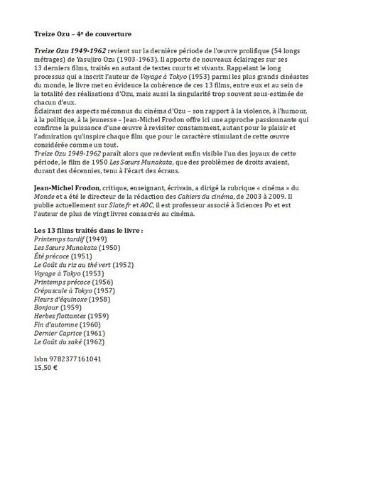 - Treize Ozu 1949-1962 paraît alors que devient enfin visible un des joyaux de la dernière partie de l’oeuvre de l’auteur de Voyage à Tokyo, le film de 1950 Les Soeurs Munakata, que des problèmes de droits avaient, durant des décennies, tenu à l’écart des écrans.