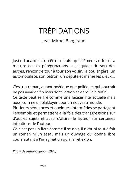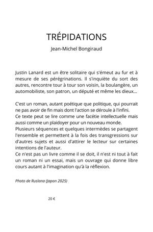 Justin Lanard est un être solitaire qui s'émeut au fur et à mesure de ses pérégrinations. Il s'inquiète du sort des autres, rencontre tour à tour son voisin, la boulangère, un automobiliste, son patron, un député et même les dieux.... C'est un roman autant poétique que politique qui pourrait ne pas avoir de fin mais dont l'action se déroule à l'infini. Ce texte peut se lire comme une facétie intellectuelle mais aussi comme un plaidoyer pour un nouveau monde. Plusieurs séquences et quelques intermèdes se partagent l'ensemble qui permettent à la fois des transgressions sur d'autres sujets et aussi d'attirer le lecteur sur certaines intentions de l'auteur. Ce n'est pas un livre comme il se doit, il n'est ni tout à fait un roman ni un essai, mais un ouvrage qui donne libre court autant à l'imagination qu'à la réflexion.