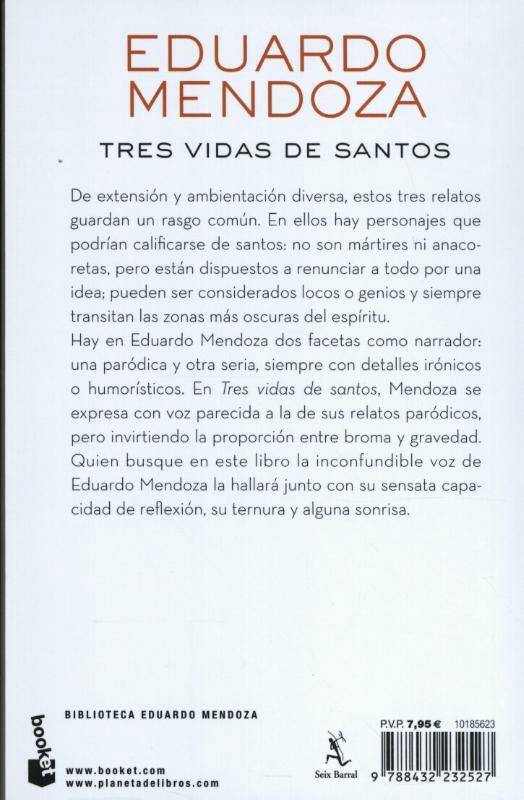 De extensión y ambientación diversa, estos tres relatos guardan un rasgo común. En ellos hay personajes que podrían calificarse de santos: no son mártires ni anacoretas, pero están dispuestos a renunciar a todo por una idea; pueden ser considerados locos o genios y siempre transitan las zonas más oscuras del espíritu. «La ballena» es el relato más cercano a las crónicas barcelonesas que han hecho célebre a Eduardo Mendoza, y se inicia en el Congreso Eucarístico de 1952; «El final de Dubslav», la de más insólita ambientación geográfica ?África?, es una narración de rotunda intensidad con un final impresionante; y por último, «El malentendido» es una profunda reflexión sobre la creación literaria y el difícil diálogo entre clases sociales, además de una variación seria del personaje del lumpen que inspira al detective de El misterio de la cripta embrujada, El laberinto de las aceitunas y La aventura del tocador de señoras. Hay en Eduardo Mendoza dos facetas como narrador: una paródica y otra seria, siempre con detalles irónicos o humorísticos. En Tres vidas de santos, Mendoza se expresa con voz parecida a la de sus relatos paródicos, pero invirtiendo la proporción entre broma y gravedad. Quien busque en este libro la inconfundible voz de Eduardo Mendoza la hallará junto con su sensata capacidad de reflexión, su ternura y alguna sonrisa.