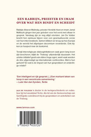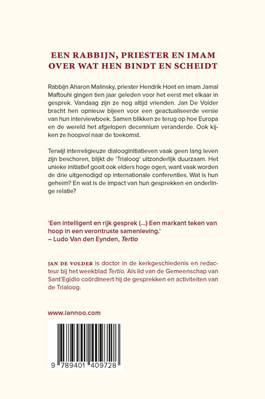 Een rabbijn, priester en imam over wat hen bindt en scheidt Rabbijn Aharon Malinsky, priester Hendrik Hoet en imam Jamal Maftouhi gingen tien jaar geleden voor het eerst met elkaar in gesprek. Vandaag zijn ze nog altijd vrienden. Jan De Volder bracht hen opnieuw bijeen voor een geactualiseerde versie van hun interviewboek. Samen blikken ze terug op hoe Europa en de wereld het afgelopen decennium veranderde. Ook kijken ze hoopvol naar de toekomst. Terwijl interreligieuze dialooginitiatieven vaak geen lang leven zijn beschoren, blijkt de 'Trialoog' uitzonderlijk duurzaam. Het unieke initiatief gooit ook elders hoge ogen, want vaak worden de drie uitgenodigd op internationale conferenties. Wat is hun geheim? En wat is de impact van hun gesprekken en onderlinge relatie?