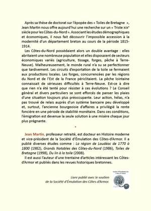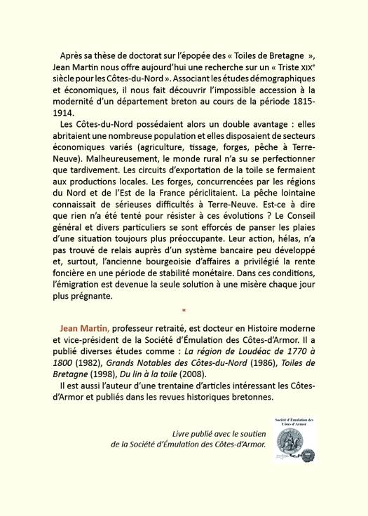 L’étude qui nous est ici proposée sur l’économie passée de notre département est une recherche rigoureuse nourrie de nombreuses sources d'archives. Etayé d’un nombre considérable de cartes, graphiques et tableaux qui soulignent les difficultés du siècle traité, l’ouvrage offert au lecteur n’en est pas moins agréable, facile à lire, agrémenté de nombreuses illustrations particulièrement vivantes et bien choisies. Malgré son titre, le livre de Jean Martin n’est pas une histoire noire des Côtes-du-Nord au 19e siècle. Il nous montre que le triste siècle du département a aussi une histoire humaine, celle de la lutte pour la modernité, celle du temps de la diversité, des grands travaux et de l’adaptation aux nouvelles règles économiques... Le récit, bien vivant, met en lumière un département qui difficilement se libérait de ses pesanteurs et avançait vers un avenir incertain.