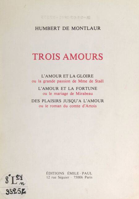 L'amour et la gloire ou la grande passion de Mme de Staël. L'amour et la fortune ou le mariage de Mirabeau. Des plaisirs jusqu'à l'amour ou le roman du comte d'Artois