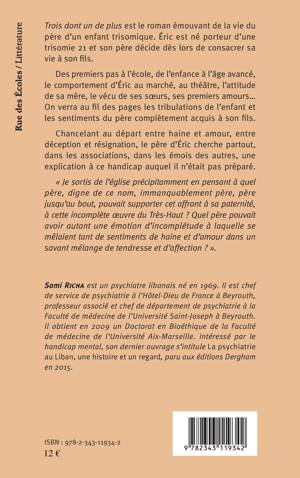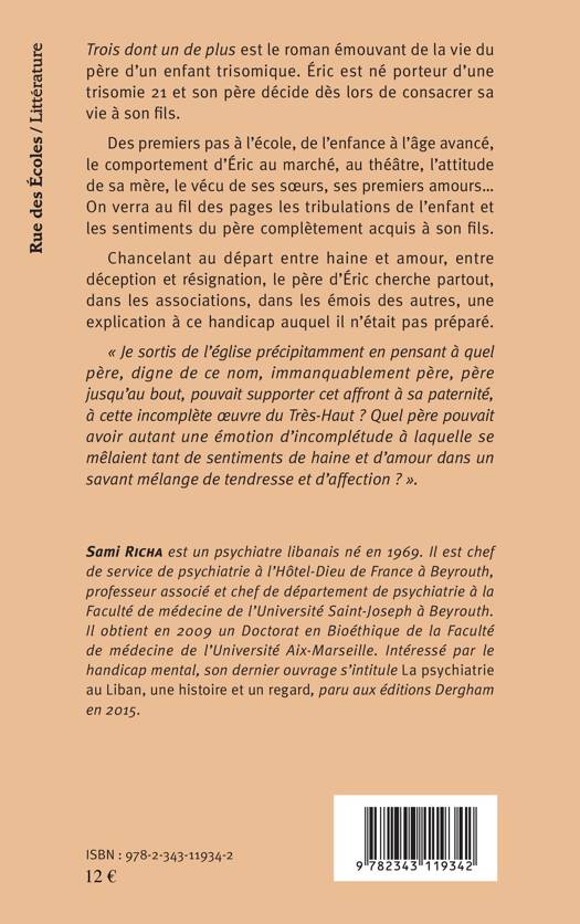 Trois dont un de plus est le roman émouvant de la vie du père d'un enfant trisomique. Chancelant au départ entre haine et amour, entre déception et résignation, le père d'Eric cherche partout, dans les associations, dans les émois des autres, une explication à ce handicap auquel il n'était pas préparé. "Je sortis de l'église précipitamment en pensant à quel père, digne de ce nom, immanquablement père, père jusqu'au bout, pouvait supporter cet affront à sa paternité, à cette incomplète oeuvre du Très-Haut ?".