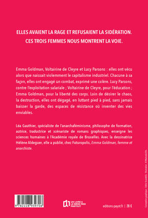 Elles avaient la rage et refusaient la sidération. Ces trois femmes nous montrent la voie. Emma Goldman, Voltairine de Cleyre et Lucy Parsons : elles ont vécu alors que naissait violemment le capitalisme industriel. Chacune à sa façon, elles ont engagé un combat, exprimé une colère. Lucy Parsons, contre l'exploitation salariale ; Voltairine de Cleyre, pour l'éducation ; Emma Goldman, pour la liberté des corps. Loin de désirer le chaos, la destruction, elles ont dégagé, en luttant pied à pied, sans jamais baisser la garde, des espaces de résistance où inventer des vies enviables.