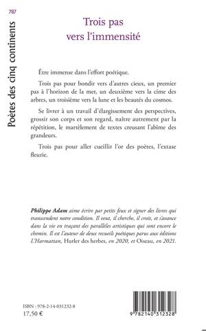 Être immense dans l'effort poétique. Trois pas pour bondir vers d'autres cieux, un premier pas à l'horizon de la mer, un deuxième vers la cime des arbres, un troisième vers la lune et les beautés du cosmos. Se livrer à un travail d'élargissement des perspectives, grossir son corps et son regard, naître autrement par la répétition, le martèlement de textes creusant l'abîme des grandeurs. Trois pas pour aller cueillir l'or des poètes, l'extase fleurie.