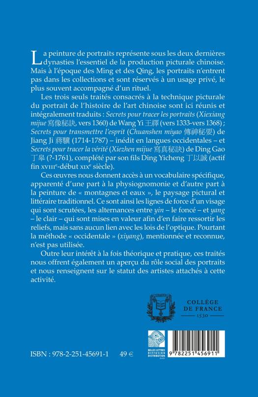 Les trois seuls traités consacrés à la technique picturale du portrait de l’histoire de l’art chinoise sont ici réunis et intégralement traduits : Secrets pour tracer les portraits (Xiexiang mijue 寫像秘訣, vers 1360) de Wang Yi 王繹 (vers 1333-vers 1368) ; Secrets pour transmettre l’esprit (Chuanshen miyao 傳神秘要) de Jiang Ji 蔣驥 (1714-1787) – inédit en langues occidentales – et Secrets pour tracer la vérité (Xiezhen mijue 寫真秘訣) de Ding Gao 丁皋 (?-1761), complété par son fils Ding Yicheng 丁以誠 (actif fin XVIIIe-début XIXe siècle).