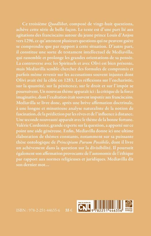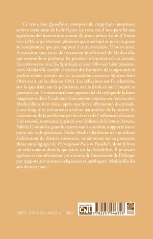English summary: This text provides a translation of the third volume, composed of twenty-eight questions, of the Quodlibet of the Franciscan Richard de Mediavilla (c.1248-c.1300). French description: Ce troisieme volume, compose de vingt-huit questions, acheve la publication des Quodlibet du franciscain Richard de Mediavilla (vers 1248-vers 1300). La date de composition (1296) est confirmee par la presence de questions qui ne peuvent guere se comprendre que par rapport a la situation de Louis d'Anjou a cette date (3, 18, 19, 20, 22 et 23). La controverse avec les Spirituels et avec Olivi est bien marquee (4 et 15). Un nouveau theme apparait: la critique de la force imaginative, dont l'exaltation etait souvent imputee aux franciscains. Mediavilla se livre donc, apres une breve affirmation doctrinale (10) a une longue et minutieuse analyse naturaliste de la notion de fascination (12), de la prediction par les reves (11) et de l'influence a distance (13). En parallele, les reflexions deja entamees sur l'eucharistie, la quantite (5), la penitence (16 et 17), le droit (26) et l'impot (28) se poursuivent.