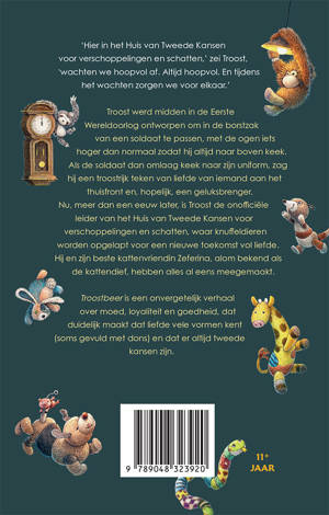 Troost werd midden in de Eerste Wereldoorlog ontworpen om in de borstzak van een soldaat te passen, met de ogen iets hoger dan normaal zodat hij altijd naar boven keek. Als de soldaat dan omlaag keek naar zijn uniform, zag hij een troostrijk teken van liefde van iemand aan het thuisfront en, hopelijk, een geluksbrenger. Nu, meer dan een eeuw later, is Troost de onofficiëleleider van het Huis van Tweede Kansen voor verschoppelingen en schatten, waar knuffeldieren worden opgelapt voor een nieuwe toekomst vol liefde. Hij en zijn beste kattenvriendin Zeferina, alom bekend als de kattendief, hebben alles al eens meegemaakt.