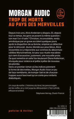 Depuis trois ans, Alice Andersen a disparu. Et, depuis tout ce temps, les gens se posent la même question : son mari l’a-t-il tuée ? Christian, inconsolable, rendu amnésique par un grave accident quelques jours après la disparition d’Alice, emploie un détective pour la retrouver. Jeune, blonde aux yeux bleus, Alice ressemble à s’y méprendre aux victimes du désormais célèbre Marionnettiste, le tueur aux rituels macabres qui assassine, justement, une nouvelle fois. De quoi remettre en selle l’ex-lieutenant Diane Kellerman, révoquée pour violence et prête à péter de nouveau les plombs. Dans un premier roman où les indices prennent la forme de charades, Morgan Audic tisse un jeu de faux-semblants, de trompe-l’œil et de chausse-trappes aussi fascinant qu’un conte pour enfants diaboliques.