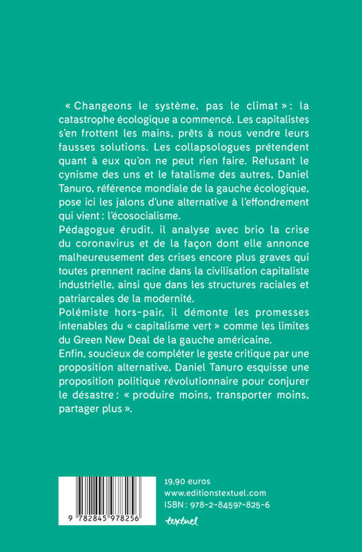 « On ne change pas un mouton en glouton » : pour Daniel Tanuro le capitalisme n'est pas réformable. Présentant une lumineuse analyse de la crise du coronavirus et plus globalement de la catastrophe écologique, l'auteur de «L'impossible capitalisme vert» argumente les moyens de l'arrêter. Ne croyant pas plus au « green new deal » qu'aux prophéties des collapsologues. Pour conjurer le désastre, Daniel Tanuro formule une proposition politique, l'écosocialisme : produire moins, transporter moins, partager plus.