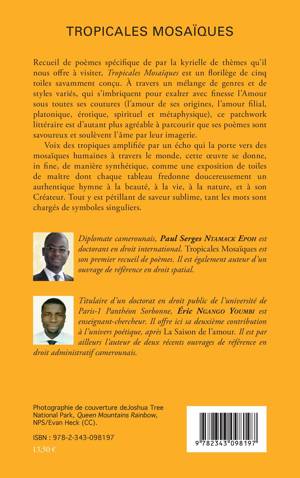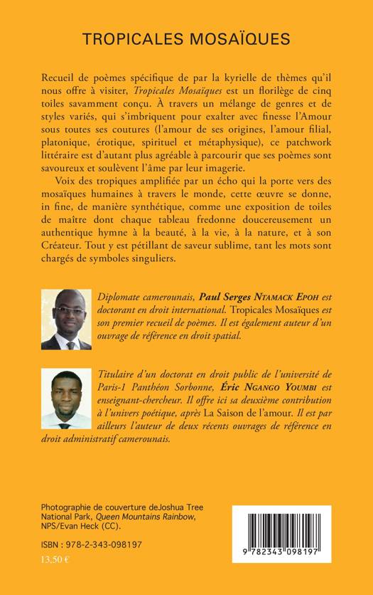 Recueil de poèmes spécifique de par la kyrielle de thèmes qu'il nous offre à visiter, Tropicales Mosaïques est un florilège de cinq toiles savamment conçu. À travers un mélange de genres et de styles variés, qui s'imbriquent pour exalter avec finesse l'Amour sous toutes ses coutures, ce patchwork littéraire est d'autant plus agréable à parcourir que ses poèmes sont savoureux et soulèvent l'âme par leur imagerie. Cette exposition de toiles dont chaque tableau fredonne doucereusement est un authentique hymne à la beauté, à la vie, à la nature, et à son Créateur.