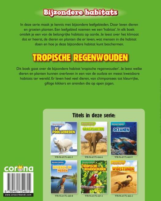 Dit boek gaat over de bijzondere habitat ‘tropische regenwouden’. Je leest welke dieren en planten kunnen overleven in een van de oudste en meest kwetsbare habitats ter wereld. Er leven heel veel dieren, van chimpansees tot kleurrijke, giftige kikkers en arenden die op apen jagen.