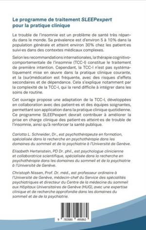 Cet ouvrage propose une adaptation de la TCC-I, développée en collaboration avec des patient·es et des équipes soignantes, permettant son application dans la pratique clinique quotidienne. Ce programme Sleepexpert devrait contribuer à améliorer la prise en charge clinique des patient·es atteint·es de trouble de l'insomnie, ainsi qu'à renforcer la santé publique.