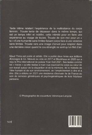 Texte intime relatant l’expérience vécue d’une forme de maltraitance du corps féminin, Trouée tente de dépasser dans le même temps, qui est un temps infini et indéfini, cette intimité pour en faire une expérience au visage de toutes. Trouée de son moi pour un « tu » d’une humanité sans limites faisant corps face à une violence sans limites. Trouée vers une image d’envol pour respirer dans une dernière vision quand le cou étranglé ne sent qu’un filet d’air. Trouée que seul rend possible le langage poétique, ses rythmes, ses traces et ses signes, pour formuler cet indicible, dans un chant coupé, sur le papier couché comme un corps sur le plancher.