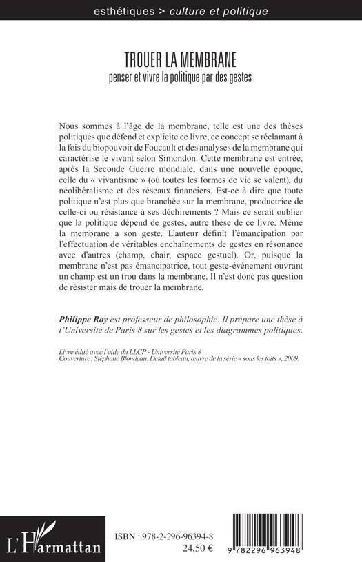 La membrane est un concept politique se réclamant à la fois du biopouvoir de Foucault et de l’analyse du niveau vital par Simondon. Elle caractérise le pouvoir de notre époque. Or la politique dépend de gestes, autre thèse de ce livre. Il est alors montré que certains gestes peuvent s’opposer à la membrane sous la forme de trouées émancipatrices.