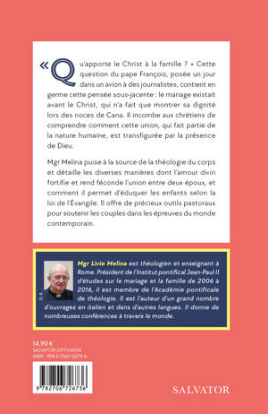 Qu'apporte le Christ à la famille ? » Cette question du pape François, posée un jour dans un avion à des journalistes, contient en germe cette pensée sous-jacente : le mariage existait avant le Christ, qui n'a fait que montrer sa dignité lors des noces de Cana. Il incombe aux chrétiens de comprendre comment cette union, qui fait partie de la nature humaine, est transfigurée par la présence de Dieu. Mgr Melina puise à la source de la théologie du corps et détaille les diverses manières dont l'amour divin fortifie et rend féconde l'union entre deux époux, et comment il permet d'éduquer les enfants selon la loi de l'Évangile. Il offre de précieux outils pastoraux pour soutenir les couples dans les épreuves du monde contemporain. AUTEUR Mgr Livio Melina est théologien et enseignant à Rome. Président de l'Institut pontifical Jean-Paul II d'études sur le mariage et la famille de 2006 à 2016, il est membre de l'Académie pontificale de théologie. Il est l'auteur d'un grand nombre d'ouvrages en italien et dans d'autres langues. Il donne de nombreuses conférences à travers le monde.