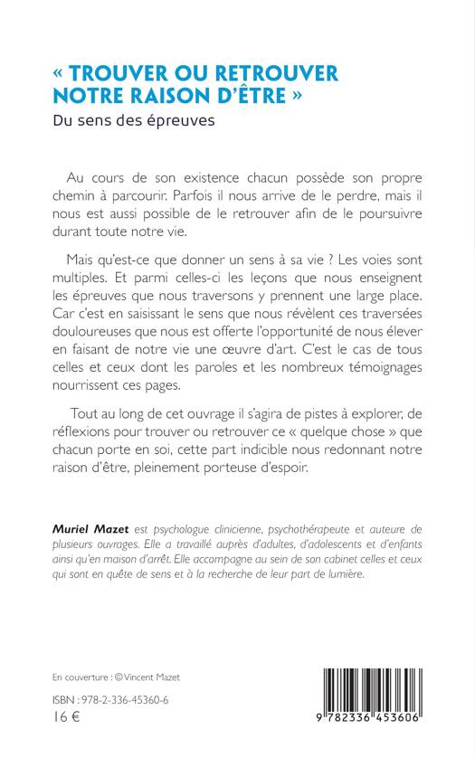 Au cours de son existence chacun possède son propre chemin à parcourir. Parfois il nous arrive de le perdre, mais il nous est aussi possible de le retrouver afin de le poursuivre durant toute notre vie. Mais qu'est-ce que donner un sens à sa vie ? Les voies sont multiples. Et parmi celles-ci les leçons que nous enseignent les épreuves que nous traversons y prennent une large place. Car c'est en saisissant le sens que nous révèlent ces traversées douloureuses que nous est offerte l'opportunité de nous élever en faisant de notre vie une oeuvre d'art. C'est le cas de tous ceux et celles dont les paroles et les nombreux témoignages nourrissent ces pages. Tout au long de cet ouvrage il s'agira de pistes à explorer, de réflexions pour trouver ou retrouver ce quelque chose que chacun porte en soi, cette part indicible nous redonnant notre raison d'être, pleinement porteuse d'espoir.