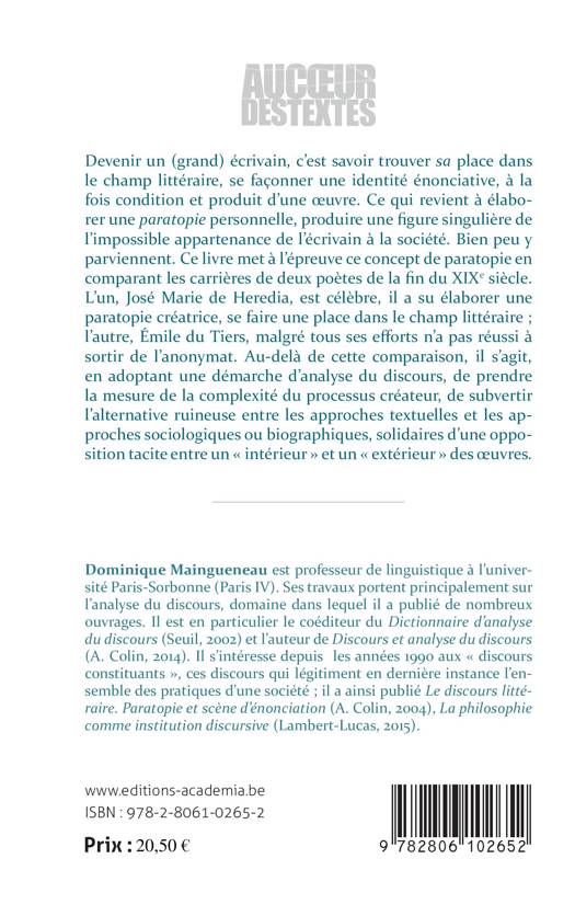 Devenir un (grand) écrivain, c'est savoir trouver sa place dans le champ littéraire, se façonner une identité énonciative, à la fois condition et produit d'une uvre. Ce qui revient à élaborer une paratopie personnelle, produire une figure singulière de l'impossible appartenance de l'écrivain à la société. Bien peu y parviennent. Ce livre met à l'épreuve ce concept de paratopie en comparant les carrières de deux poètes de la fin du XIXe siècle : José Maria de Heredia et Emile du Tiers.
