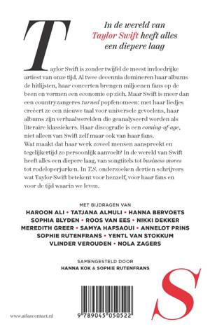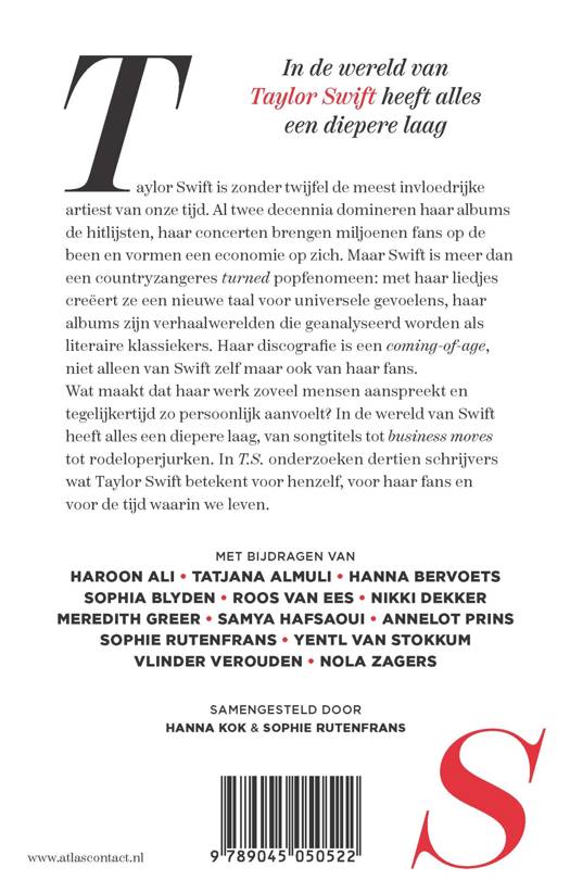 In T.S. onderzoeken dertien schrijvers wat Taylor Swift betekent voor henzelf, voor haar fans en voor de tijd waarin we leven. Met bijdragen van Haroon Ali, Tatjana Almuli, Hanna Bervoets, Sophia Blyden, Nikki Dekker, Roos van Ees, Meredith Greer, Samya Hafsaoui, Annelot Prins, Sophie Rutenfrans, Yentl van Stokkum, Vlinder Verouden, Nola Zagers.
