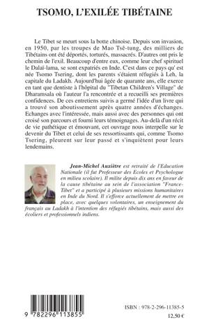 Le Tibet se meurt sous la botte chinoise. Depuis son invasion, en 1950, par les troupes de Mao Tsê-tung, des milliers de Tibétains ont été déportés, torturés, massacrés. D'autres ont pris le chemin de l'exil. Beaucoup d'entre eux, comme leur chef spirituel le Dalaï-lama, se sont exilés en Inde. C'est dans ce pays qu'est née Tsomo Tsering, dont les parents s'étaient réfugiés à Leh, la capitale du Ladakh. Aujourd'hui âgée de quarante ans, elle exerce en tant que dentiste à l'hôpital du "Tibetan Children's Village", où l'auteur a recueilli ses premières confidences.