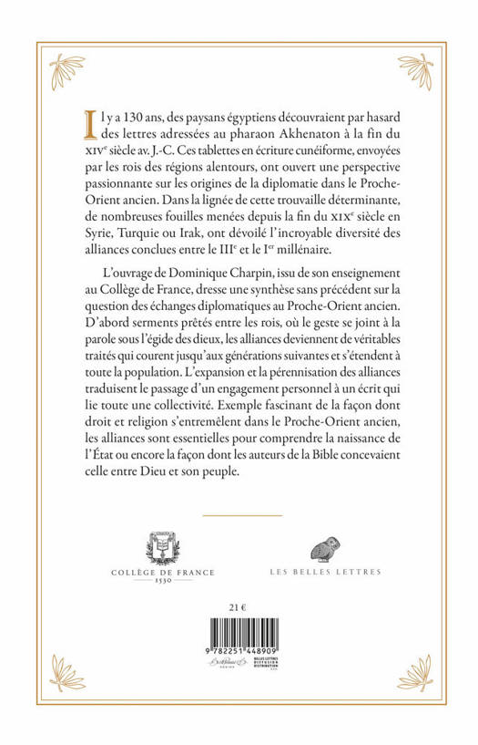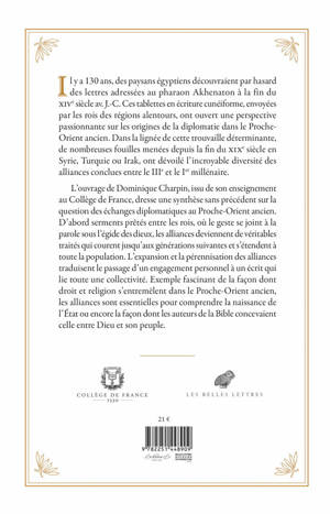 L’ouvrage de Dominique Charpin, issu de son enseignement au Collège de France, dresse une synthèse sans précédent sur la question des échanges diplomatiques au Proche-Orient ancien. D’abord serments prêtés entre les rois, où le geste se joint à la parole sous l’égide des dieux, les alliances deviennent de véritables traités qui courent jusqu’aux générations suivantes et s’étendent à toute la population. L’expansion et la pérennisation des alliances traduisent le passage d’un engagement personnel à un écrit qui lie toute une collectivité. Exemple fascinant de la façon dont droit et religion s’entremêlent dans le Proche-Orient ancien, les alliances sont essentielles pour comprendre la naissance de l’État ou encore la façon dont les auteurs de la Bible concevaient celle entre Dieu et son peuple.