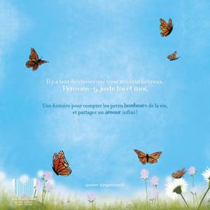 Quand arrive bientôt l'heure du dodo, c'est le moment idéal pour compter les bonheurs de la journée : tenir sur ses deux pied, s'amuser, apprendre de ses erreurs, partager, découvrir une nouvelle cachette secrète, c'est tout cela qui rend heureux.