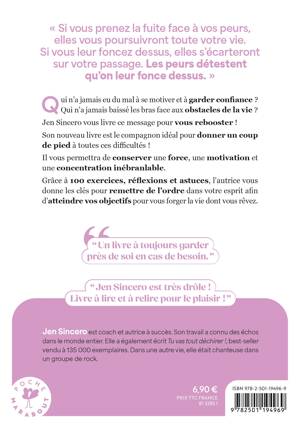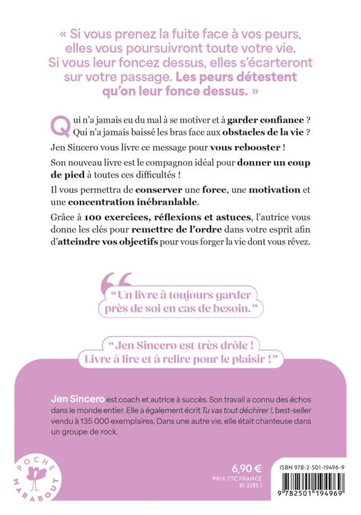 Qui n’a jamais eu du mal à se motiver et à garder confiance ? Qui n’a jamais eu envie de baisser les bras face aux obstacles de la vie ? « Si vous prenez la fuite face à vos peurs, elles vous poursuivront toute votre vie. Si vous leur foncez dessus, elles s’écarteront sur votre passage. Les peurs détestent qu’on leur fonce dessus. » Jen Sincero, la pro de la confiance en soi, vous livre ce message pour vous aider à envoyer valser toutes ces difficultés. Gardez-le en tête, cela vous permettra de conserver une force, une motivation et une concentration inébranlable. Grâce à 100 exercices, réflexions et astuces, l’autrice donne les clés pour remettre de l’ordre dans votre esprit afin d’atteindre vos objectifs et vous forger la vie dont vous rêvez.