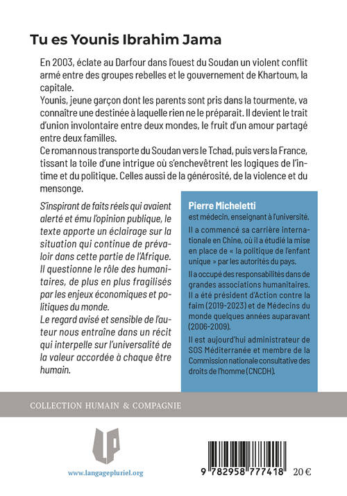 En 2003, éclate au Darfour dans l’ouest du Soudan un violent conflit armé entre des groupes rebelles et le gouvernement de Khartoum, la capitale. Younis, jeune garçon dont les parents sont pris dans la tourmente, va connaître une destinée à laquelle rien ne le préparait. Il devient le trait d’union involontaire entre deux mondes, le fruit d’un amour partagé entre deux familles. Ce roman nous transporte du Soudan vers le Tchad, puis vers la France, tissant la toile d’une intrigue où s’enchevêtrent les logiques de l’intime et du politique. Celles aussi de la générosité, de la violence et du mensonge. S’inspirant de faits réels qui avaient alerté et ému l’opinion publique, le texte apporte un éclairage sur la situation qui continue de prévaloir dans cette partie de l’Afrique. Il questionne le rôle des humanitaires, de plus en plus fragilisés par les enjeux économiques et politiques du monde. Le regard avisé et sensible de l’auteur nous entraîne dans un récit qui interpelle sur l’universalité de la valeur accordée à chaque être humain.