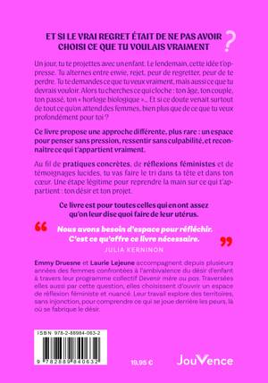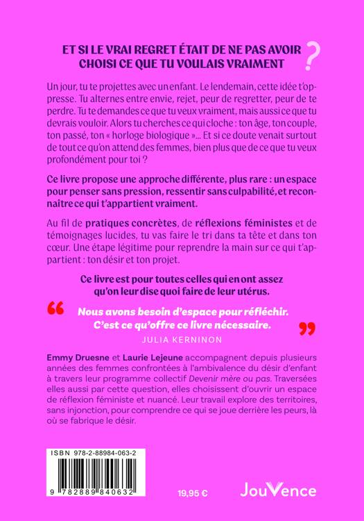 Un jour, tu te projettes avec un enfant. Le lendemain, cette idée t’oppresse. Tu alternes entre envie, rejet, peur de regretter, peur de te perdre. Tu te demandes ce que tu veux vraiment, mais aussi ce que tu devrais vouloir. Alors tu cherches ce qui cloche : ton âge, ton couple, ton passé, ton « horloge biologique »… Et si ce doute venait surtout de tout ce qu’on attend des femmes, bien plus que de ce que tu veux profondément pour toi ?