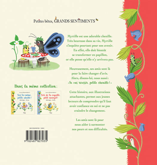 Premier ouvrage d’une série de trois titres qui abordent les questionnements de petits personnages sur leur identité et leur personnalité. L’histoire consiste à rassurer le héros ou l’héroïne et à dépasser ses appréhensions. Ici la petite chenille redoute le moment où elle va devoir se transformer en papillon. Elle est angoissée par un avenir qu’elle ne connaît pas alors qu’elle apprécie sa vie actuelle. Un mentor va lui montrer que finalement grâce à l’amitié dont elle est entourée, tout va bien se passer et elle ne perdra pas au change. Grandir est une belle aventure !