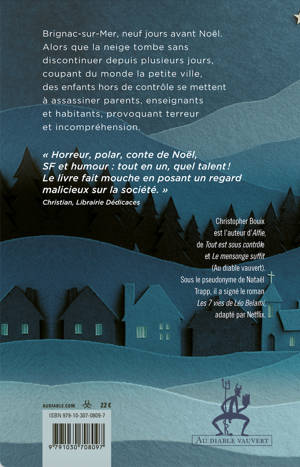 Brignac-sur-Mer, neuf jours avant Noël. Alors que la neige tombe sans discontinuer depuis plusieurs jours, coupant du monde la petite ville, des enfants hors de contrôle se mettent à assassiner parents, enseignants et habitants, provoquant terreur et incompréhension. « Horreur, polar, conte de Noël, SF et humour : tout en un, quel talent ! Le livre fait mouche en posant un regard malicieux sur la société. » Christian, Librairie Dédicaces Christopher Bouix est l’auteur d’Alfie, de Tout est sous contrôle et Le mensonge suffit (Au diable vauvert). Sous le pseudonyme de Nataël Trapp, il a signé le roman Les 7 vies de Léo Belami, adapté par Netflix.