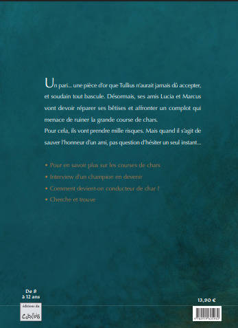 Au cœur de la cité gallo-romaine, suivez Marcus, sa sœur Lucia et leur ami Tullius, un garçon passionné par les paris. À la veille d'une grande course de chars, Tullius accepte une pièce d'or pour participer à un complot visant à saboter l'un des attelages. Sans le dénoncer, Marcus et Lucia vont déjouer ce plan et sauver la course. Une aventure palpitante qui transporte les jeunes lecteurs dans l'univers fascinant des courses de chars romaines tout en abordant des thèmes universels comme l'amitié, l'honnêteté et le courage face aux tentations. Idéal pour les enfants curieux d'histoire et avides d'action !