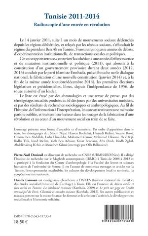 Cet ouvrage retrace les quatre années de débats, d'expérimentation institutionnelle, de transactions sociales et politiques qui ont suivi la chute du régime de Ben Ali. Le livre est étayé par des chronologies et une revue de presse, par des témoignages encadrés produits au fil des jours par des universitaires tunisiens, et par des résultats de recherches sociologiques et anthropologiques. Au fil de l'histoire, de l'information à l'interprétation, les auteurs restituent une mémoire parfois oubliée, et invitent leur lecteur dans les rouages de la fabrication d'une révolution et au coeur d'un mouvement social en train de se faire.