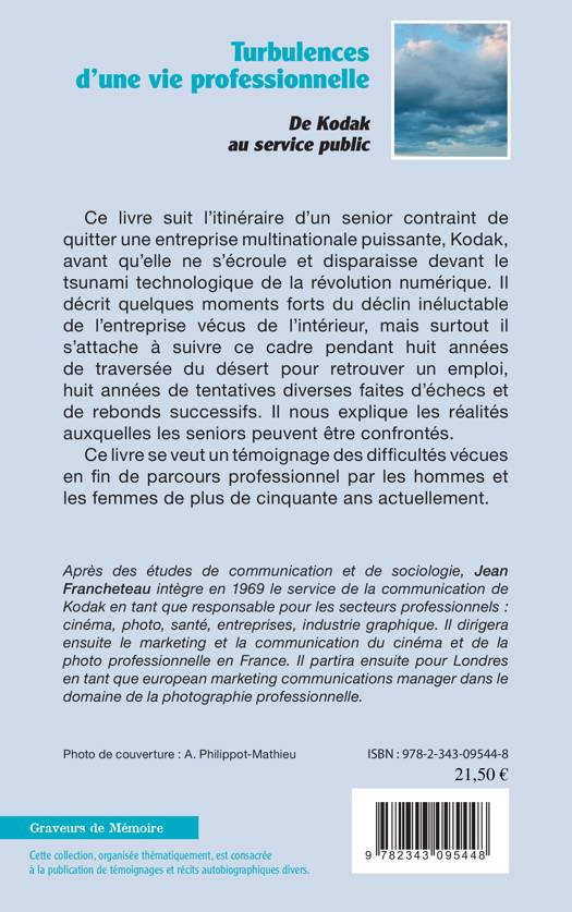Ce livre suit l'itinéraire d'un senior contraint de quitter une puissante multinationale, Kodak, avant qu'elle ne s'écroule et disparaisse devant le tsunami technologique de la révolution numérique. S'il décrit certains moments forts du déclin inéluctable de l'entreprise vécus de l'intérieur, ce livre se veut aussi un témoignage sur les réalités et les difficultés vécues en fin de parcours professionnel par les hommes et les femmes de plus de cinquante ans sur le marché du travail.