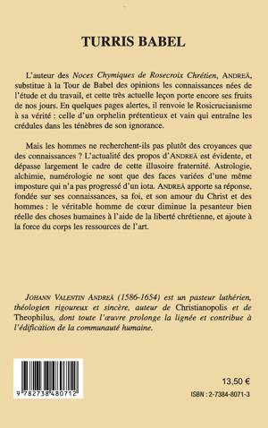 Andreae substitue à la Tour de Babel des opinions les connaissances nées de l'étude et du travail, et cette très actuelle leçon porte encore ses fruits de nos jours. En quelques pages alertes , il renvoie le Rosicrucianisme à sa vérité : celle d'un orphelin prétentieux et vain qui entraîne les crédules dans les ténèbres de son ignorance.