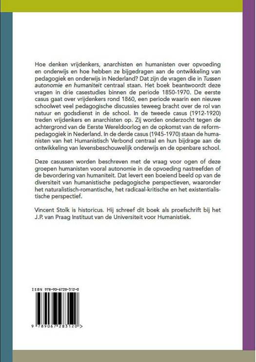 Humanistisch erfgoed 19 Hoe denken vrijdenkers, anarchisten en humanisten over opvoeding en onderwijs en hoe hebben ze bijgedragen aan de ontwikkeling van pedagogiek en onderwijs in Nederland? Dat zijn de vragen die in Tussen autonomie of humaniteit centraal staan. Het boek beantwoordt deze vragen in drie casestudies binnen de periode 1850-1970. De eerste casus gaat over vrijdenkers rond 1860, een periode waarin een nieuwe schoolwet veel pedagogische discussies teweeg bracht over de rol van natuur en godsdienst in de school. In de tweede casus (1912-1920) treden vrijdenkers en anarchisten op. Zij worden onderzocht tegen de achtergrond van de Eerste Wereldoorlog en de opkomst van de reformpedagogiek in Nederland. In de derde casus (1945-1970) staan de humanisten van het Humanistisch Verbond centraal en hun bijdrage aan de ontwikkeling van levensbeschouwelijk onderwijs en de openbare school. Deze casussen worden beschreven met de vraag voor ogen of deze groepen humanisten vooral autonomie in de opvoeding nastreefden of de bevordering van humaniteit. Dat levert een boeiend beeld op van de diversiteit van humanistische pedagogische perspectieven, waaronder het naturalistisch-romantische, het radicaal-kritische en het existentialistische perspectief.