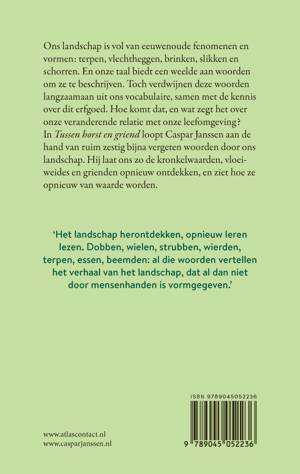 In Tussen horst en griend loopt Caspar Janssen aan de hand van ruim zestig bijna vergeten woorden door ons landschap. Hij laat ons zo de kronkelwaarden, vloeiweides en grienden opnieuw ontdekken, en ziet hoe ze opnieuw van waarde worden.