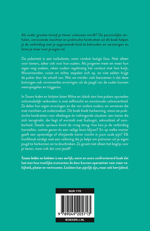 In Tussen leiden en loslaten laten Jakob en Miloe zien hoe het opvoeden van pubers onlosmakelijk verbonden is met zelfinzicht en emotionele volwassenheid. Ze delen hun eigen ervaringen en die van andere ouders, en verweven die met inzichten uit onderzoeken. Ze bieden herkenning, steun en praktische handvatten voor alledaagse én indringende situaties: een tiener die zich terugtrekt, die liegt of worstelt met faalangst, seksualiteit of somberheid. Steeds opnieuw komt de vraag terug: hoe kun je de verbinding herstellen, ruimte geven én een veilige basis blijven? En op welke manier geeft een opstandige of afwijzende tiener inzicht in de oude pijn van de ouder? Elk hoofdstuk eindigt met een oefening die helpt om patronen uit je eigen jeugd te herkennen en te doorbreken. Zo groeit het begrip voor je tiener, en voor jezelf.