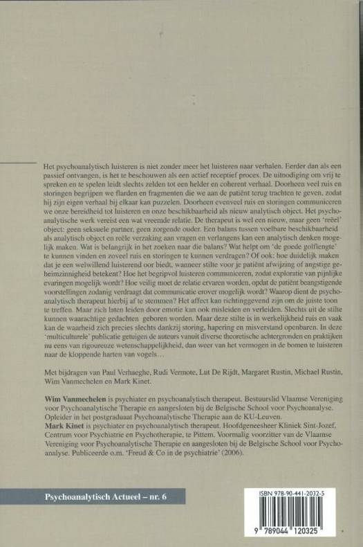 Het psychoanalytisch luisteren is niet zonder meer het luisteren naar verhalen. Eerder dan als een passief ontvangen, is het te beschouwen als een actief receptief proces. De uitnodiging om vrij te spreken en te spelen leidt slechts zelden tot een helder en coherent verhaal. Doorheen veel ruis en storingen begrijpen we flarden en fragmenten die we aan de patiënt terug trachten te geven, zodat hij zijn eigen verhaal bij elkaar kan puzzelen. Doorheen evenveel ruis en storingen communiceren we onze bereidheid tot luisteren en onze beschikbaarheid als nieuw analytisch object. Het psychoanalytische werk vereist een wat vreemde relatie. De therapeut is wel een nieuw, maar geen 'reëel' object: geen seksuele partner, geen zorgende ouder. Een balans tussen voelbare beschikbaarheid als analytisch object en reële verzaking aan vragen en verlangens kan een analytisch denken mogelijk maken. Wat is belangrijk in het zoeken naar die balans? Wat helpt om 'de goede golflengte' te kunnen vinden en zoveel ruis en storingen te kunnen verdragen? Of ook: hoe duidelijk maken dat je een welwillend luisterend oor biedt, wanneer stilte voor je patiënt afwijzing of angstige geheimzinnigheid betekent? Hoe het begripvol luisteren communiceren, zodat exploratie van pijnlijke evaringen mogelijk wordt? Hoe veilig moet de relatie ervaren worden, opdat de patiënt beangstigende voorstellingen zodanig verdraagt dat communicatie erover mogelijk wordt? Waarop dient de psychoanalytisch therapeut hierbij af te stemmen? Het affect kan richtinggevend zijn om de juiste toon te treffen. Maar zich laten leiden door emotie kan ook misleiden en verleiden. Slechts uit de stilte kunnen waarachtige gedachten geboren worden. Maar deze stilte is in werkelijkheid ruis en vaak kan de waarheid zich precies slechts dankzij storing, hapering en misverstand openbaren. In deze 'multiculturele' publicatie getuigen de auteurs vanuit diverse theoretische achtergronden en praktijken nu eens van rigoureuze wetenschappelijkheid, dan weer van het vermogen in de bomen te luisteren naar de kloppende harten van vogels...